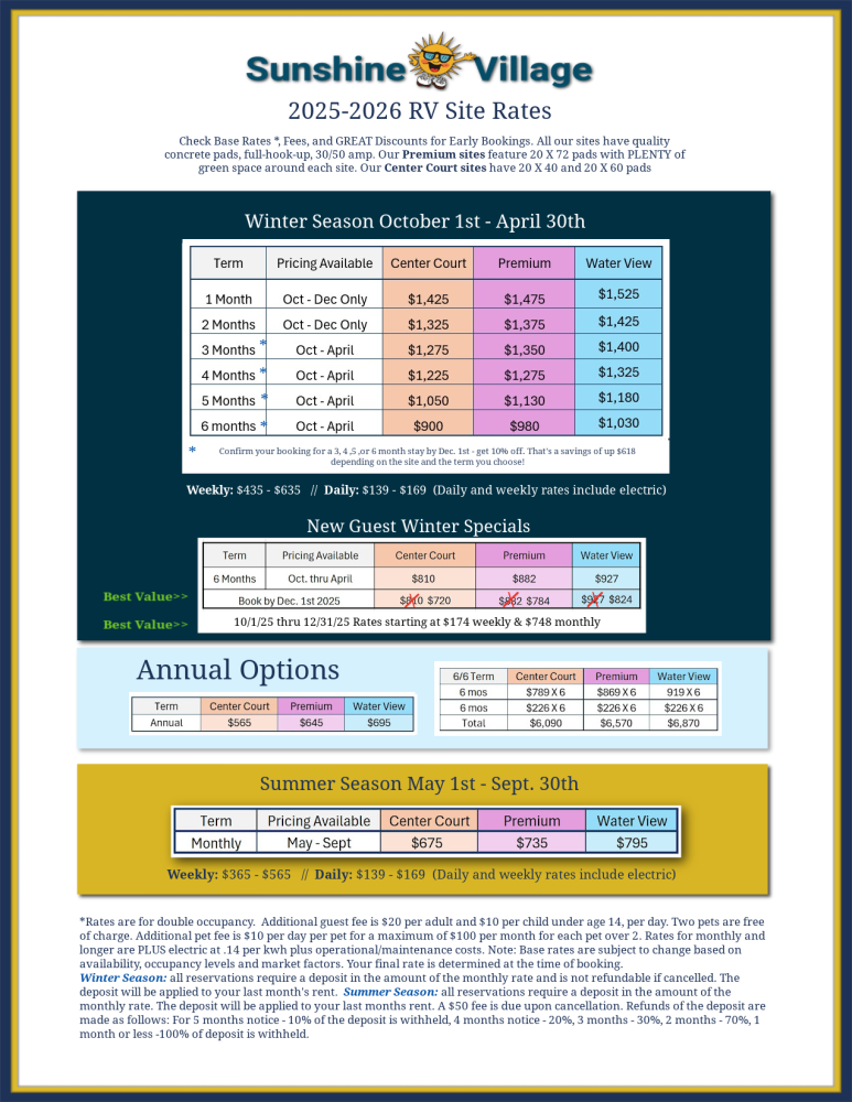 Explore base rates, fees and GREAT discounts for early bookings. ALL of our RV sites have quality concrete pads, full hook-up, and 30/50 amp. Our premium sites feature 20 x 72 pads with PLENTY of green space around each site. Our standard center court sites have 20 x 40 and 20 x 60 pads.