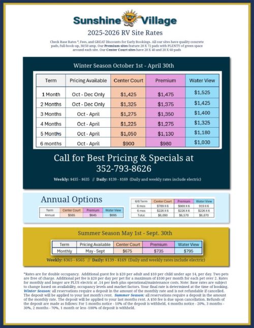 You must call us directly to reserve an RV site at Sunshine Village at 352-689-1276. Or use the “Request RV Site” button below.